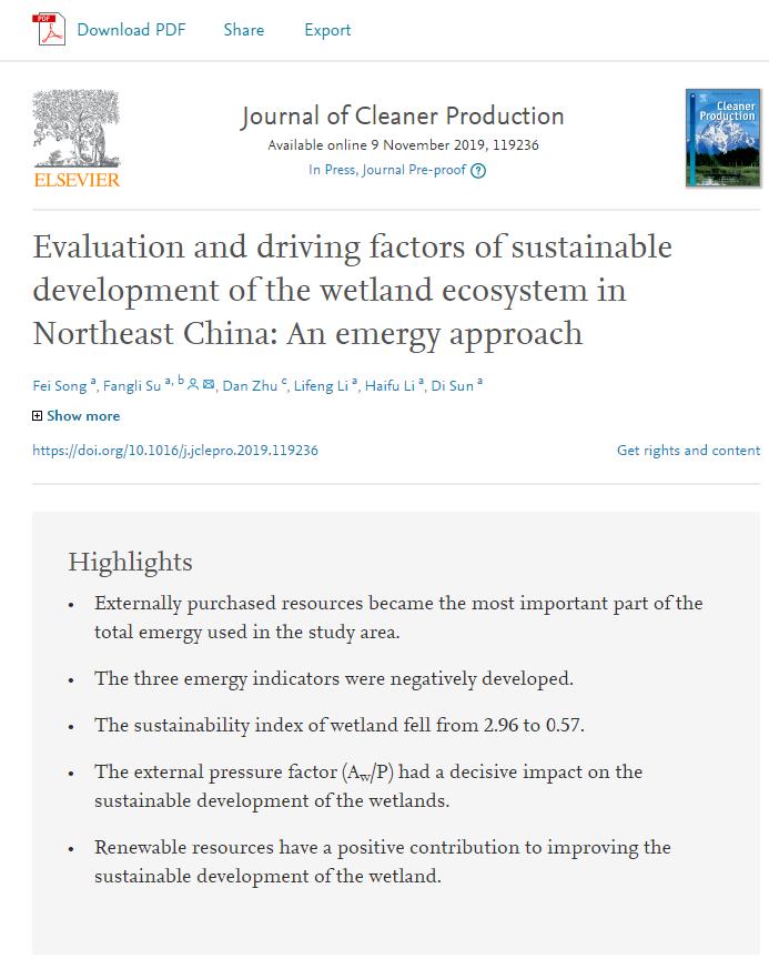 Journal of Cleaner Production是环境科学与生态学领域一区Top期刊,5年平均影响因子为7.051。文章通过能值方法(Emergy
